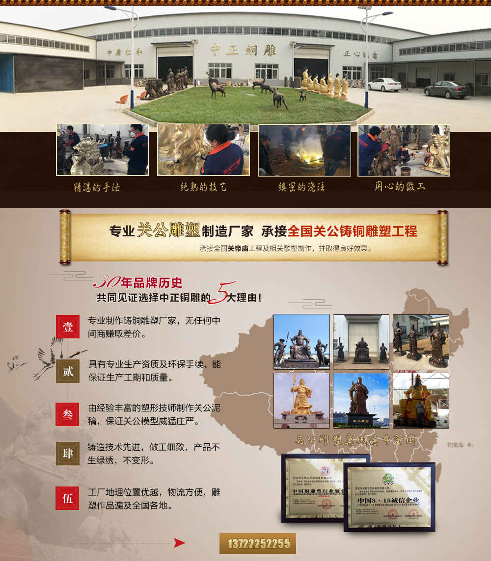 河北中正銅工藝品制造有限公司是一家具有獨立設(shè)計、雕塑、鑄造、制作施工能力的單位。擁有完善的,大型的,先進(jìn)的生產(chǎn)設(shè)備,并由多位經(jīng)驗豐富的高級鑄造技師指導(dǎo)生產(chǎn)及制作。公司主要鑄造銅關(guān)公,九龍銅關(guān)公,福建銅關(guān)公,臺灣銅關(guān)公,關(guān)羽雕塑,鑄銅關(guān)公,銅雕關(guān)公,1米銅關(guān)公,2米銅關(guān)公等,可按客戶提供動物銅雕圖片訂做加工銅關(guān)公,九龍銅關(guān)公,做工精美,質(zhì)量保證。